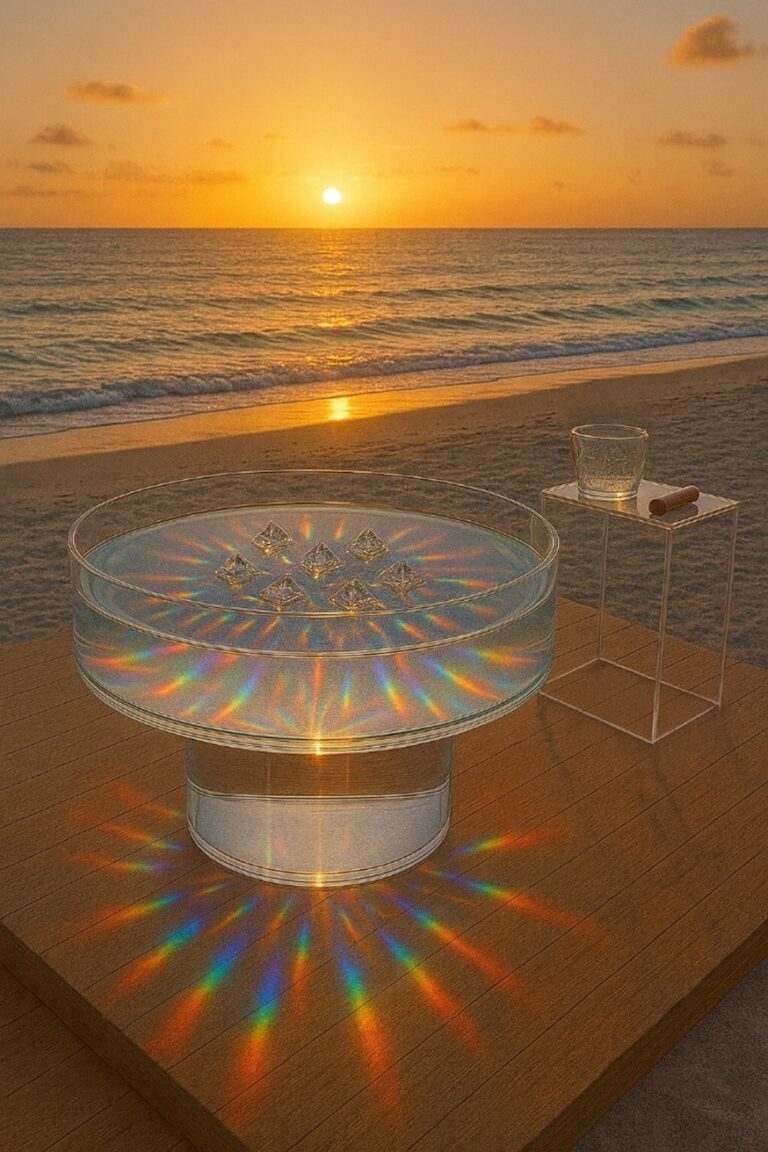 Meanwhile, the fractured glass cubes begin to interact with sunlight. Internal cracks refract the light, creating small rainbows that shimmer below the water’s surface.