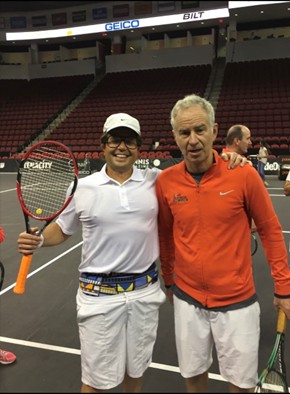 Andy playing tennis with John McEnroe at a charity event in Boston, wearing Björn Borg underwear. Predictably, McEnroe got mad when he noticed. Then—older, mellower—he smiled for the photo.