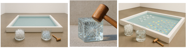 The visitor then selects a glass cube. Using a wooden mallet placed nearby, they tap the cube to create a subtle internal fracture. A shattering occurs inside the cube while its external form remains intact. The fractured glass cube is then tossed into the pool, where it sinks slowly below the surface.