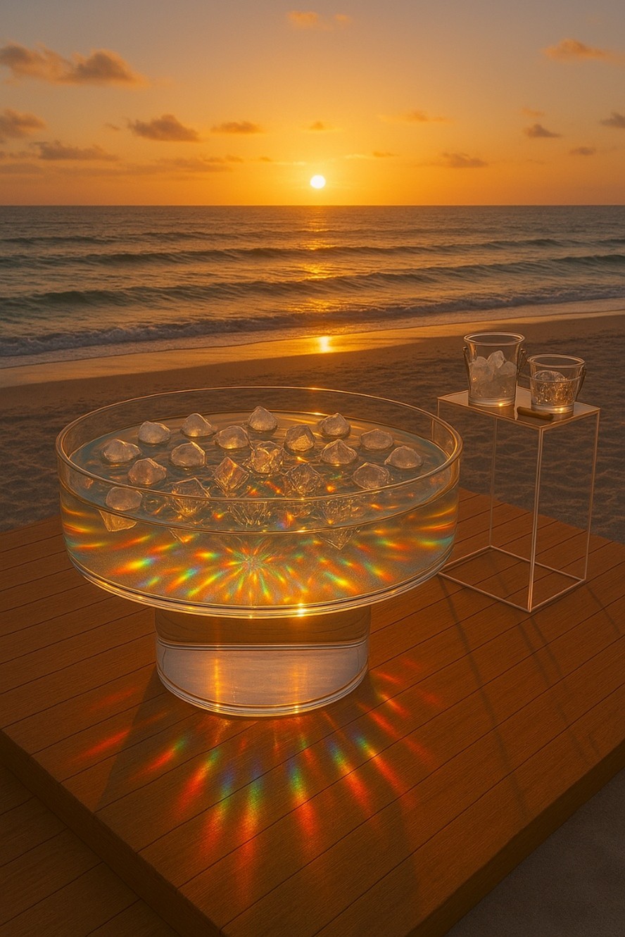 Water is the only natural element that exists commonly in all three physical states: solid, liquid, and gas. Temperature catalyzes its transformation. The introduction or removal of energy reorganizes its internal structure and changes the ratio of air embedded within it. This installation uses these characteristics as a medium for exploring perception, time, and transformation. By juxtaposing water, ice, and glass the piece reveals how slight internal differences create profound visual and symbolic divergence.