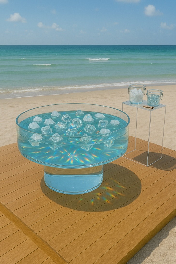 The visitor lifts an ice cube and tosses it gently into the pool. Because the crystalline structure of ice expands and traps air, it floats effortlessly on the surface. - Take a Glass Cube